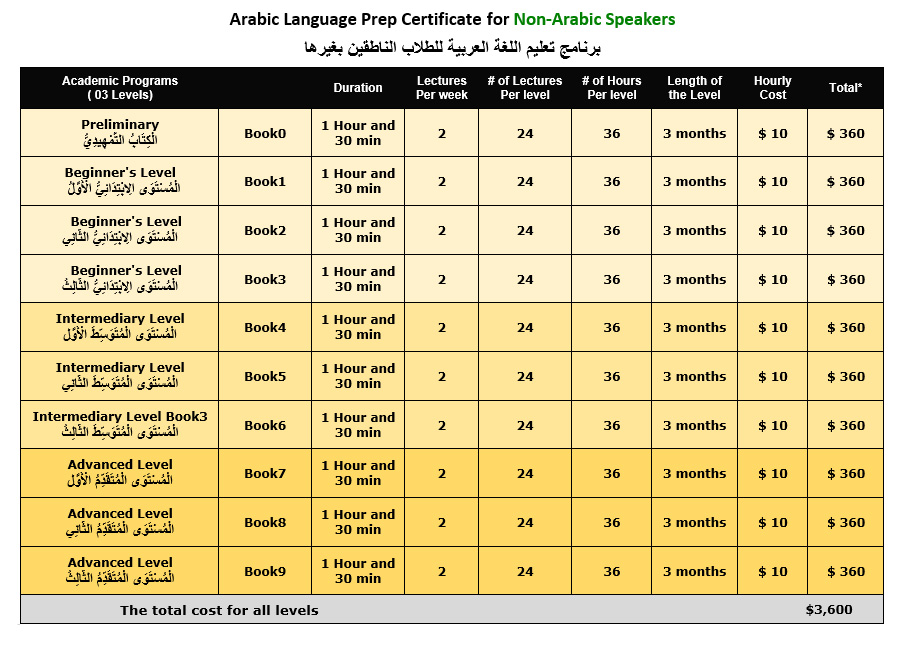 4- ينبغي على الطالب اجتياز الاختبار النهائي لكل مستوى حتى يحصل على شهادة حضور بذلك، وفي نهاية البرنامج يأخذ شهادة نهائية مجمعة على كل البرنامج.